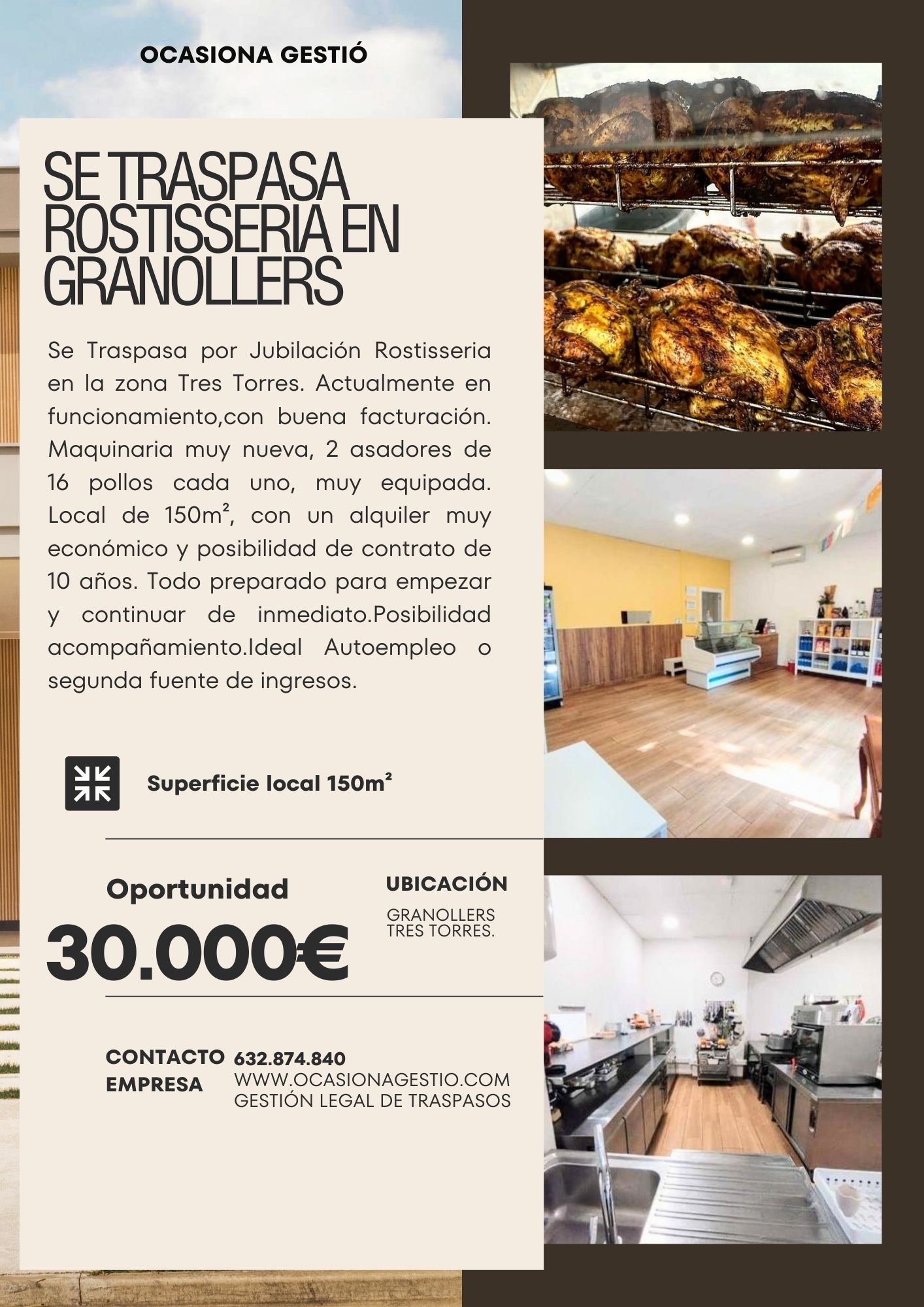 Se Traspasa Rostisseria Comida para llevar en Granollers. Negocio en funcionamiento, buena facturación demostrable. Local 150m², ubicado en buena zona de Granollers.