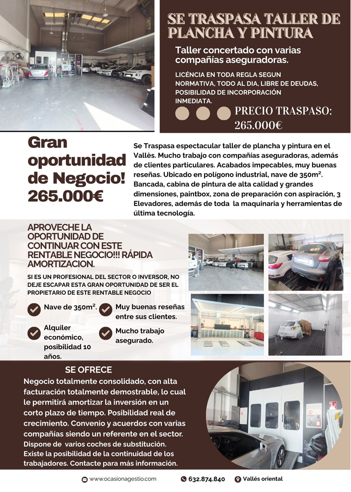 Se Traspasa Taller de Plancha y Pintura en el Vallés. Nave de más de 300m², Taller concertado con todas las Compañías Aseguradoras, Gran volumen de trabajo y una muy buena facturación, posibilidad de aumentarla. Sus instalaciones estan equipadas con la mejor maquinaria y herramientas de altísima calidad, contando con la última tecnología en reparaciones. Cabina de pintura de grandes dimensiones, zona de preparación, Bancada, etc.. . totalmente equipado!