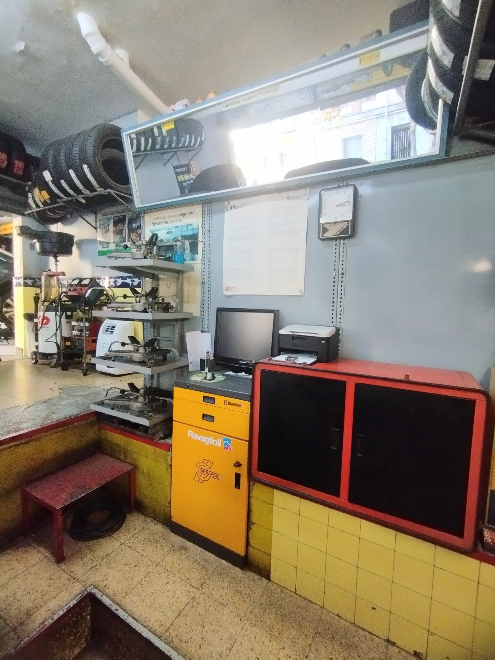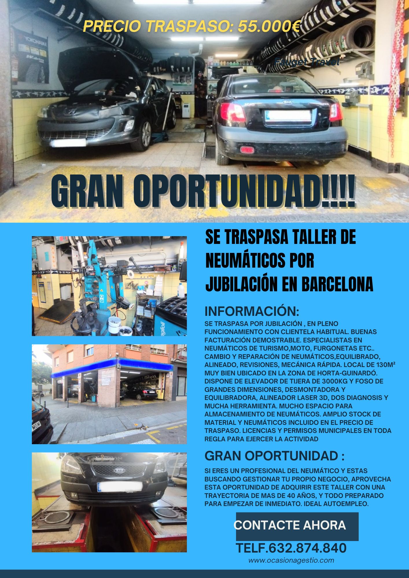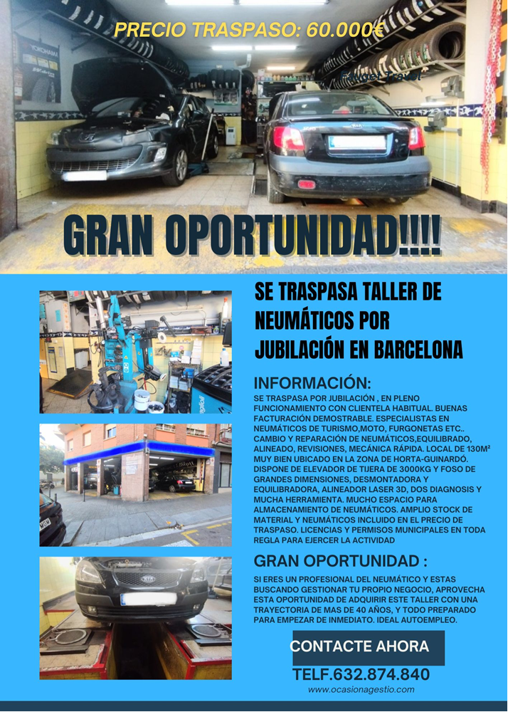Se traspasa taller de neumáticos por jubilación en barcelona. Actualmente en funcionamiento y con buena facturación, clientela habitual. Taller especialista en neumáticos de turismo, moto, furgonetas y 4×4. Cambio y reparación de neumáticos, equilibrado, alineado de direcciónes, revisiones, distribuciónes, frenos, amortiguadores, embragues, baterias, diagnosis, revisiónes pre- itv. Local de 100m² con un alquiler muy asequible, equipado con un elevador de tijera de 3000kg y foso de grandes dimensiones con gato hidráulico. Desmontadora, equilibradora, alineador laser 3d, diagnosis texa y autel. Dispone de mucho espacio para neumáticos.